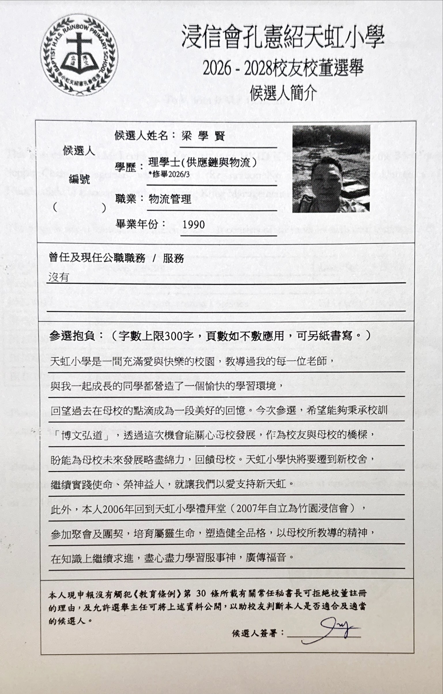 *有關梁學賢先生簡介,請參閱母校網頁校友校董選舉候選人簡介。