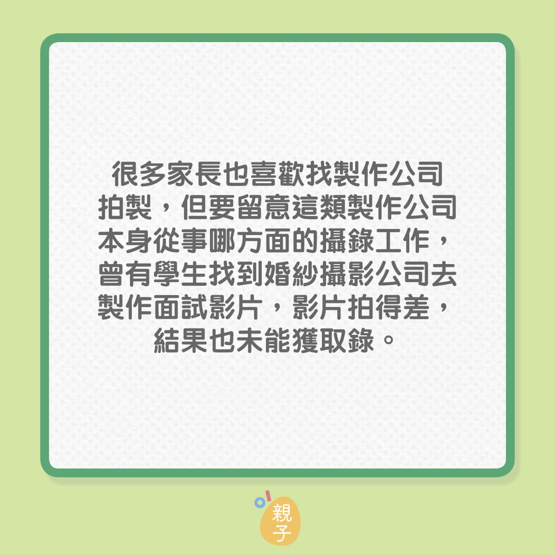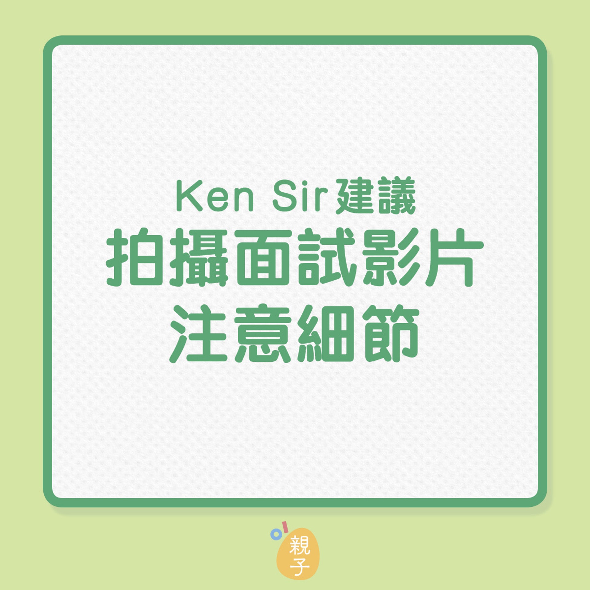 今年有部分學校取消面見,以交影片及網上面試取代親身面見。Ken Sir提醒家長拍攝面試影片時要留意,他說:「有很多家長也喜歡找製作公司拍製,但要留意這類製作公司本身從事哪方面的攝錄工作,曾有學生找到婚紗攝影公司去製作面試影片,影片拍得差,結果也未能獲取錄。」