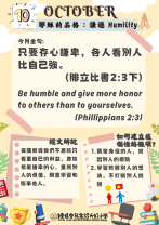 「只要存心謙卑,各人看別人比自己強。」(腓立比書 2:3下) Be humble and give more honor to others than to yourselves.(Phillippians2:3)