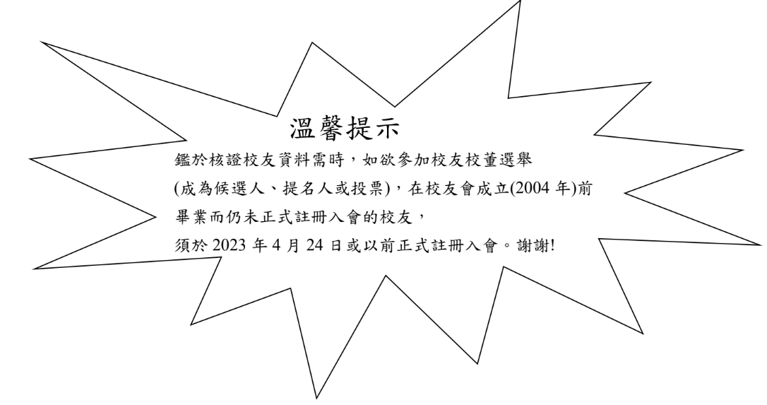 2023年4月24日至5月8日為本校法團校董會校友校董選舉的提名期,歡迎各校友自薦或推舉合適候選人(兩者均須有兩名和議人)參選,詳情請參閱法團校董會 校友校董選舉安排 及 校董選舉簡介。
